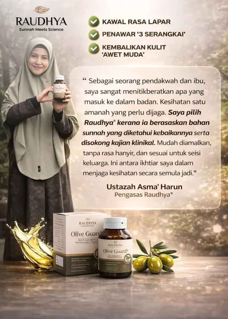 "Dalam Berjuang Dengan Urusan Dakwah Amat Penting Untuk Ustazah Sentiasa Sihat Bertenaga. Sebab Itu Beliau Amalkan Olive Guard+ Raudhya"